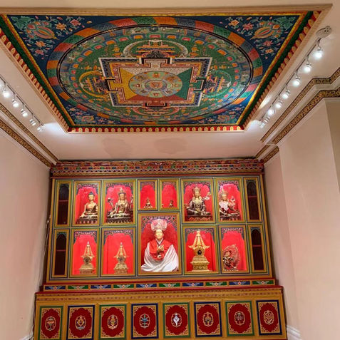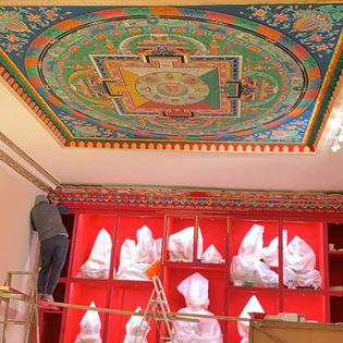 Once the ceiling was ready, the group placed the Mandala, painted by Lopon Tandin, and the Tsa-tsas, painted by Sangyum Sonam Chokyi la, Semo Dechen and Semo Tseyang la. Lopon Jampal, then, inspected the shrine to choose the color of paint for the shrine's designs: