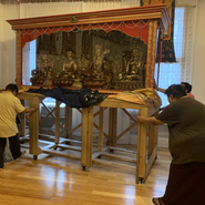 In July of 2020, Michael returned to set up panels for the temple's hallway and refurbished the sangha's coatrack, which was painted by Lopon Lulu and Karma Gelek a few days later when the panels were completely set up: